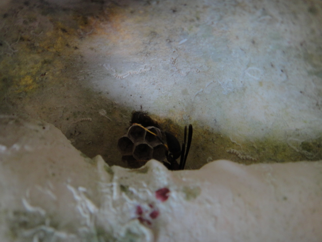 a wasp has decided that one of our large snail shells makes a good place for a nest - i am not so sure...